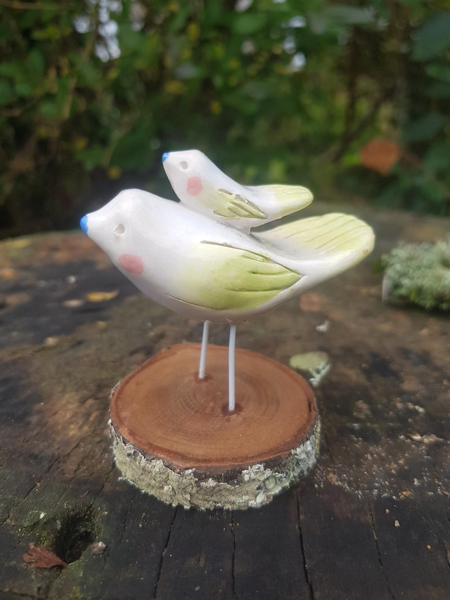 Oiseaux vert en faïence, sur socle en bois ( collé), fait main, pièce unique. Taille 8cm, poids 70g